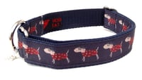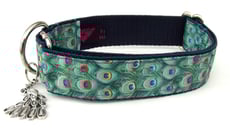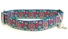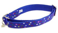 High quality polypropylene webbing single-loop design collars finished with printed grosgrains, woven jacquards and embroidered trims. All made using hard weariing nickel-plated sliders and a welded D-ring to attach your dog's tag to.