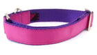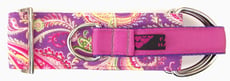 A multicoloured 100% cotton fabric stitched on to tough webbing with phlox purple satin lining. The 25mm (1") deep control loop is made from tough, high quality purple webbing finished with a deep pink grosgrain trim.