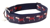 Single loop design house/ tag collar made with tough grosgrain trim securely stitched on to navy blue high quality polypropylene webbing.