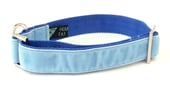 Single loop design house/ tag collar made with powder blue velvet securely stitched on to royal blue high quality webbing.